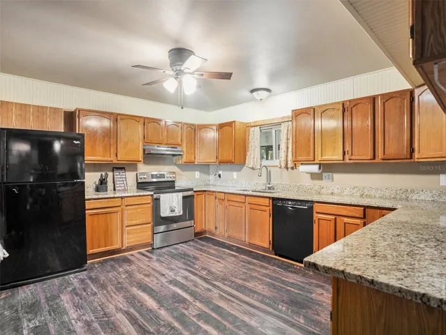 • Granite countertops, custom wood accents, wood-burning fireplace