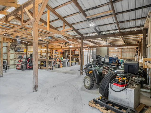 • 36′ x 42′ workshop w/ electric, LED lighting, garage space, 30-amp RV hookup & 150-PSI air compressor