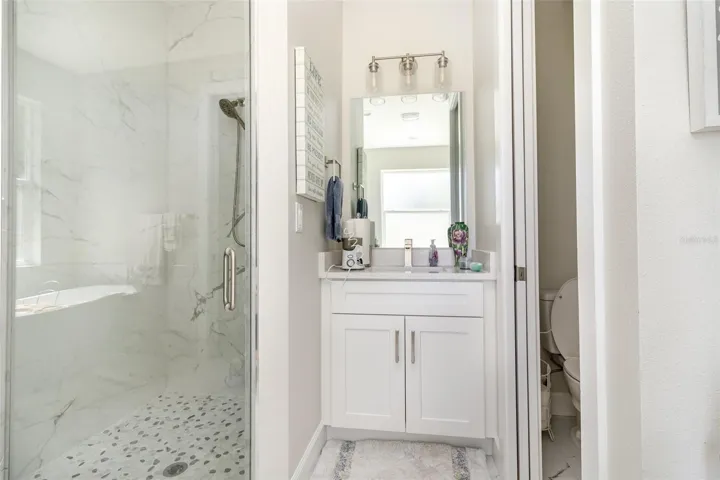 Freestanding tub oversized walk-in shower, and custom built-in closet.