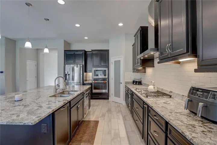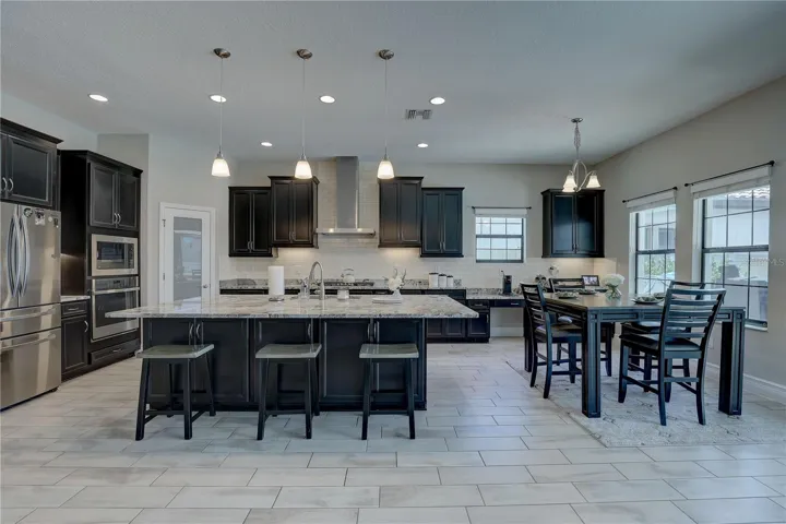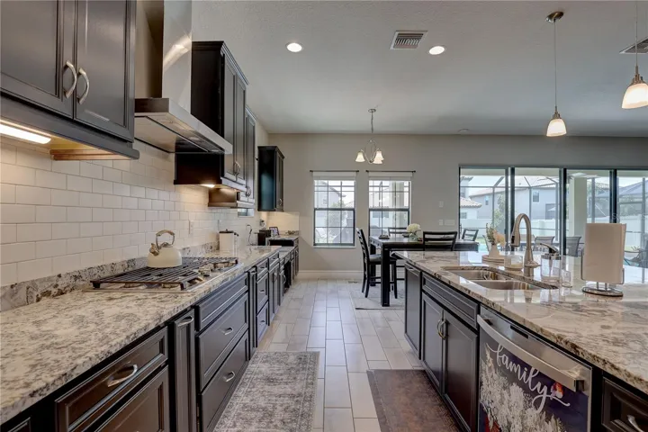 The heart of the home is the extended chef’s kitchen, featuring solid wood cabinetry—including added storage under the oversized island—stone countertops, and high-end stainless steel appliances including a built-in oven and gas cooktop. The kitchen opens seamlessly into a spacious family room with ceiling-mounted surround sound speakers, creating the perfect setting for entertaining or relaxing at home.