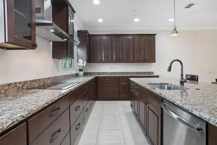 Upstairs, the main level offers a refined living room with copper tray ceiling, crown molding, a spacious and inviting dining area. The gourmet kitchen impresses with an oversized island with bar seating, abundant 42″ soft-close cabinetry and drawers, upgraded stainless steel appliances and elegant crown molding. Enjoy an abundance of natural light from brand-new 2025 windows, and step out onto the expansive balcony with custom electric screens overlooking tranquil pond views.
