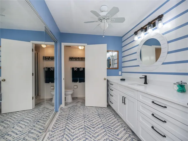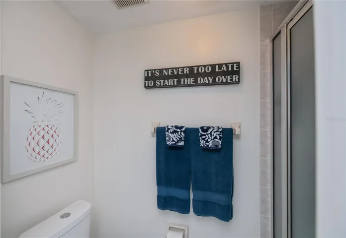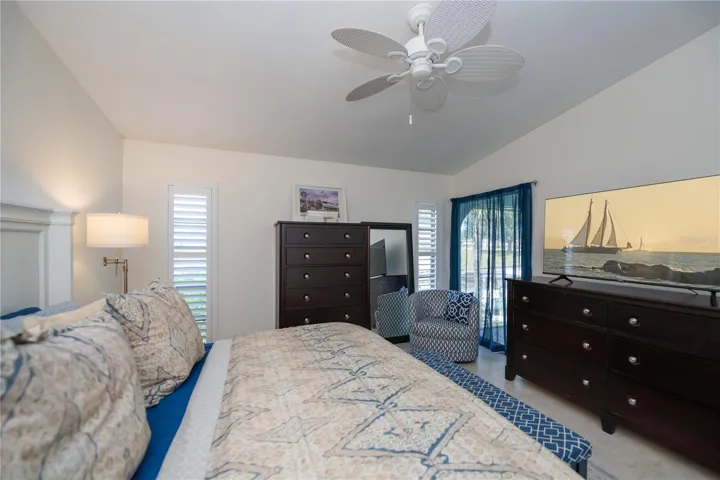 The ample primary bedroom holds a King Sized Bed along with dressers, chests, nightstands and a comfortable chair. It also has patio doors opening ono the lanai. A well lit primary bathroom includes a private commode room and large walk-in shower and closet.