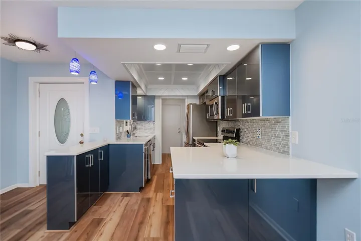 A beautiful hand painted mural greets you as you enter this unique two bedroom, two bath condominium with vaulted ceiling. Totally updated with newer kitchen; breakfast bar, abundance of cabinets and drawers, newer appliances, LVT flooring throughout, plus much more!