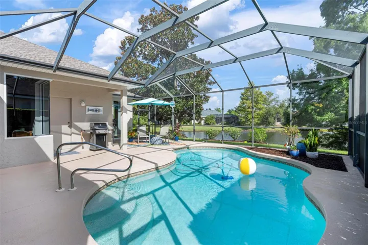 Welcome to this stunning four-bedroom, three-bath home with an additional flex room in the highly sought-after neighborhood of Greenbrook Village. From the moment you walk in, you’ll be captivated by the open floor plan offering gorgeous views of the outdoor caged, heated pool and the sparkling lake just beyond. Surrounded by mature landscaping, an irrigation system, and a lush privacy hedge, this home provides complete peace and seclusion from neighbors—your own private paradise.