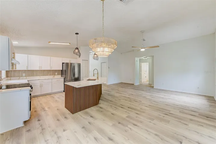 Step inside and fall in love with the open-concept design, vaulted ceilings, and beautiful luxury vinyl plank flooring throughout. The brand-new kitchen steals the show with gleaming quartz countertops featuring elegant gold veining, a dramatic wood-slat island with seating for six, brass fixtures, all-new stainless-steel appliances, and abundant cabinetry. The spacious great room and dining area flow effortlessly together, perfect for entertaining or everyday living.