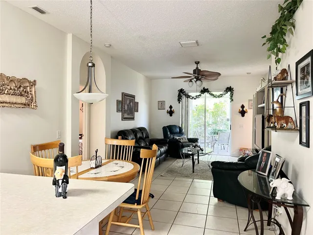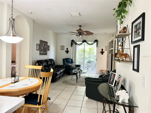This wonderful home features an inviting front walkway that leads to a decorative glass door crowned by a beautiful arched window, filling the interior with natural light from front to back. The two versatile front rooms can serve as formal living areas, a home office, or game spaces to fit your lifestyle.The spacious kitchen offers ample cabinet and counter space, newer appliances, and a large closet pantry—perfect for all your culinary needs. A peninsular bar separates the kitchen from the dinette area, creating the ideal spot for gathering with family and friends.The cozy family room includes built-in planter shelving, perfect for displaying favorite décor pieces. The master suite is a true retreat with a large walk-in closet, while the master bath features dual sinks, a relaxing garden tub, and a separate shower.Step from the family room onto the screened back patio—an excellent place to unwind and enjoy the Florida sunshine. Community amenities include a pool, tennis court, basketball court, and playground. Conveniently located just minutes from I-75, this home provides easy access to Tampa, Wiregrass Mall, Tampa Premium Outlets, and a variety of restaurants and retail shops. Don’t miss the opportunity to make this beautiful home yours!